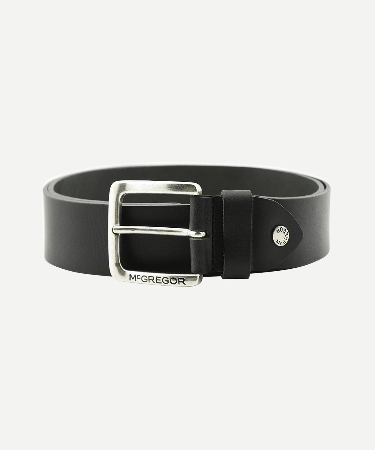 This stylish leather belt is crafted from high-quality leather. It features a metal buckle with an etched "McGregor" logo. The belt is 4 cm wide and complements any classic outfit.