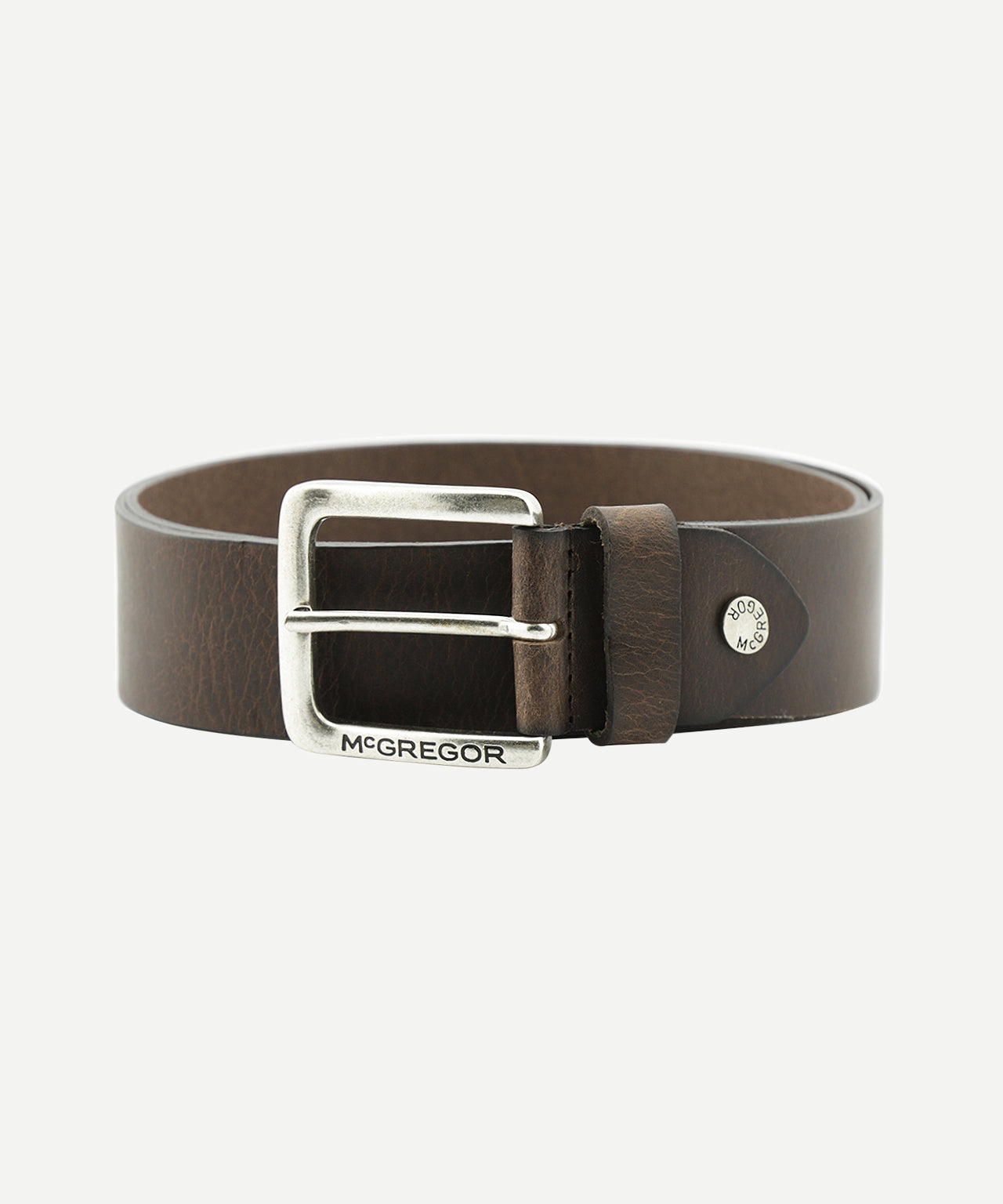 This stylish leather belt is crafted from high-quality leather. It features a metal buckle with an etched "McGregor" logo. The belt is 4 cm wide and complements any classic outfit.