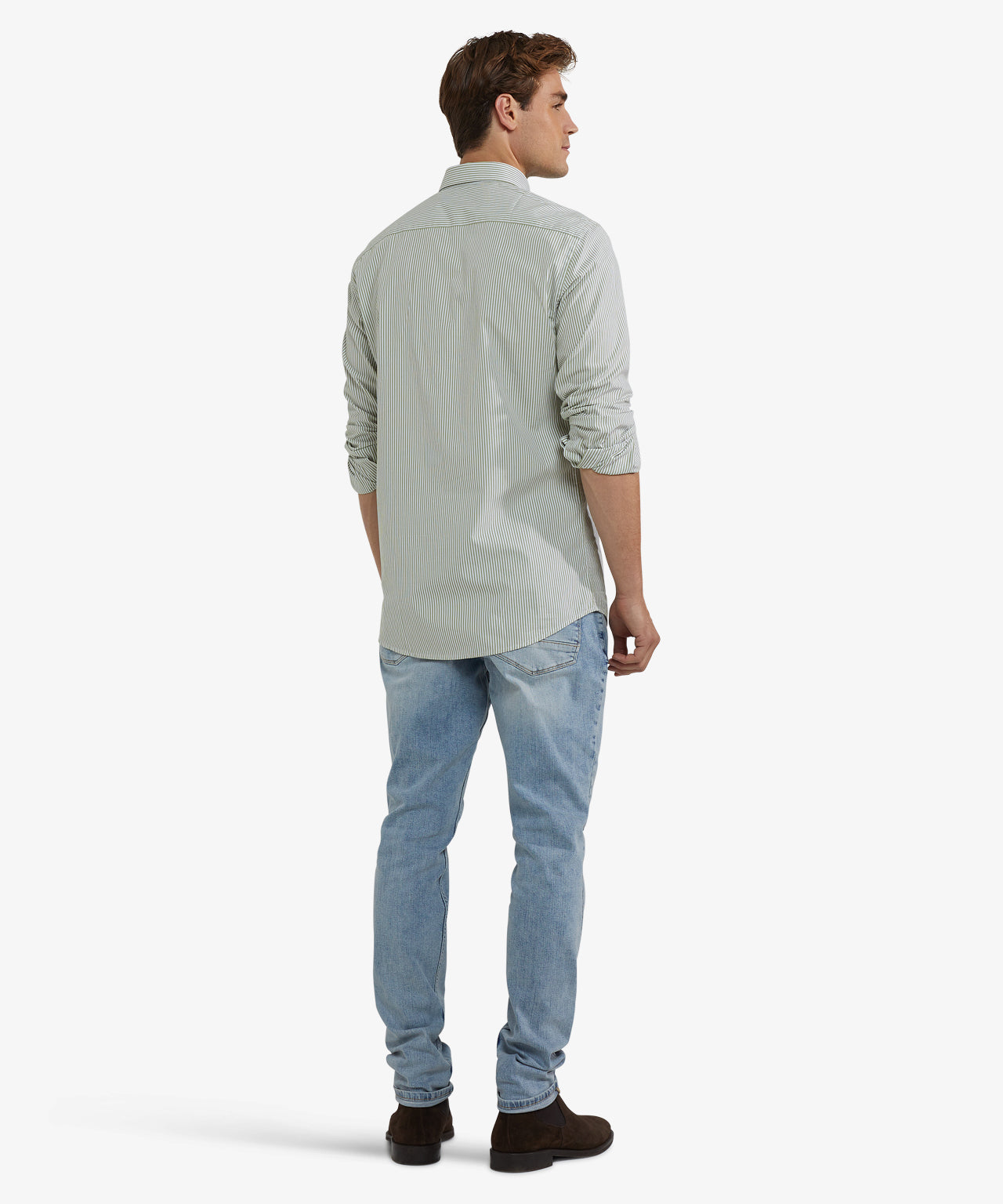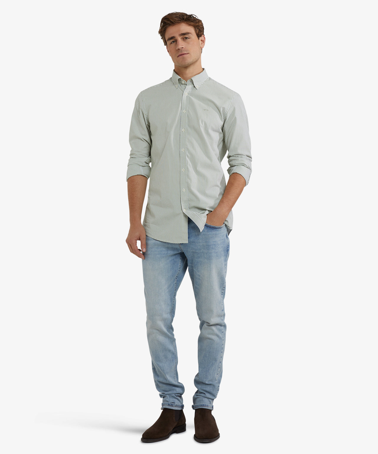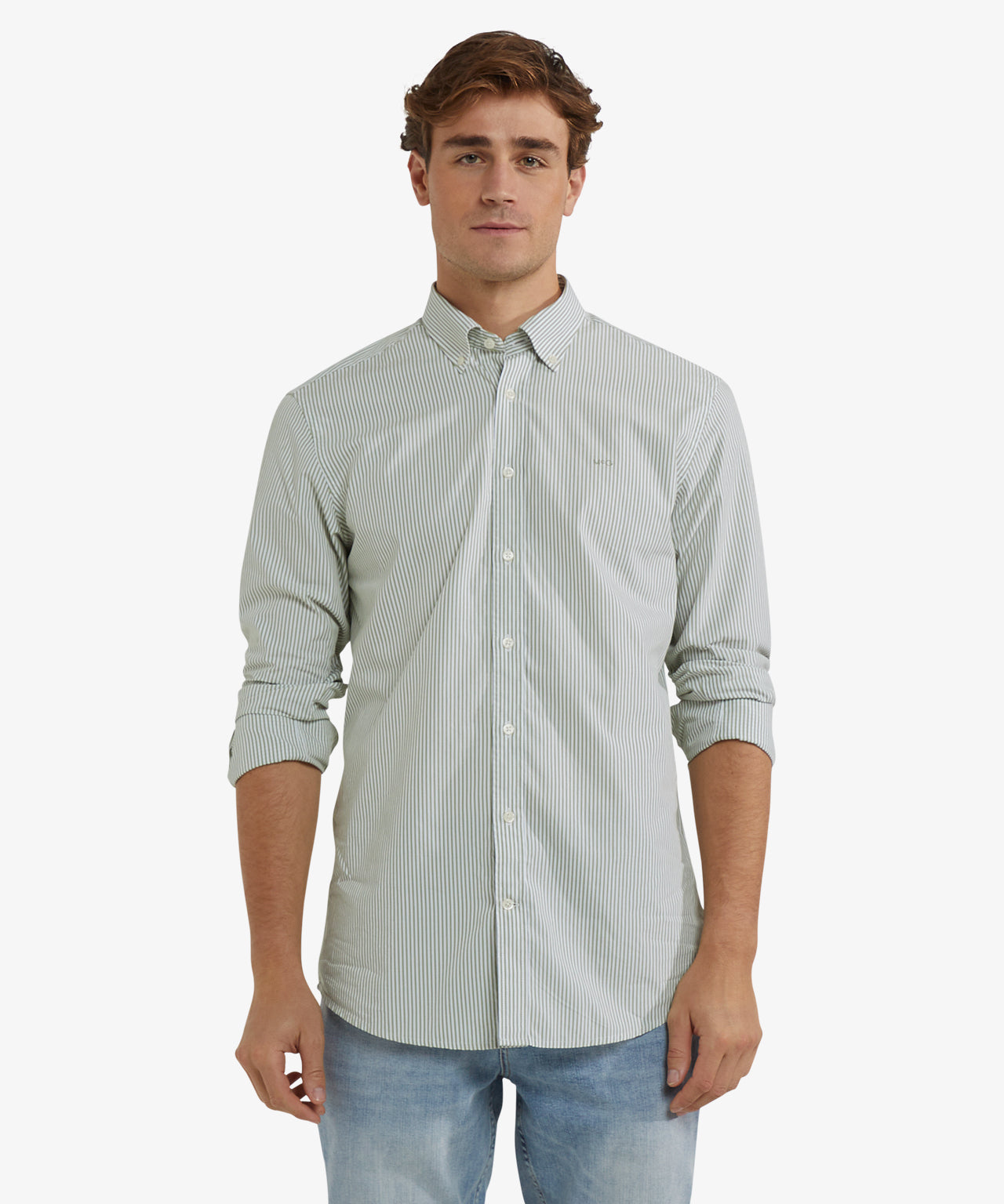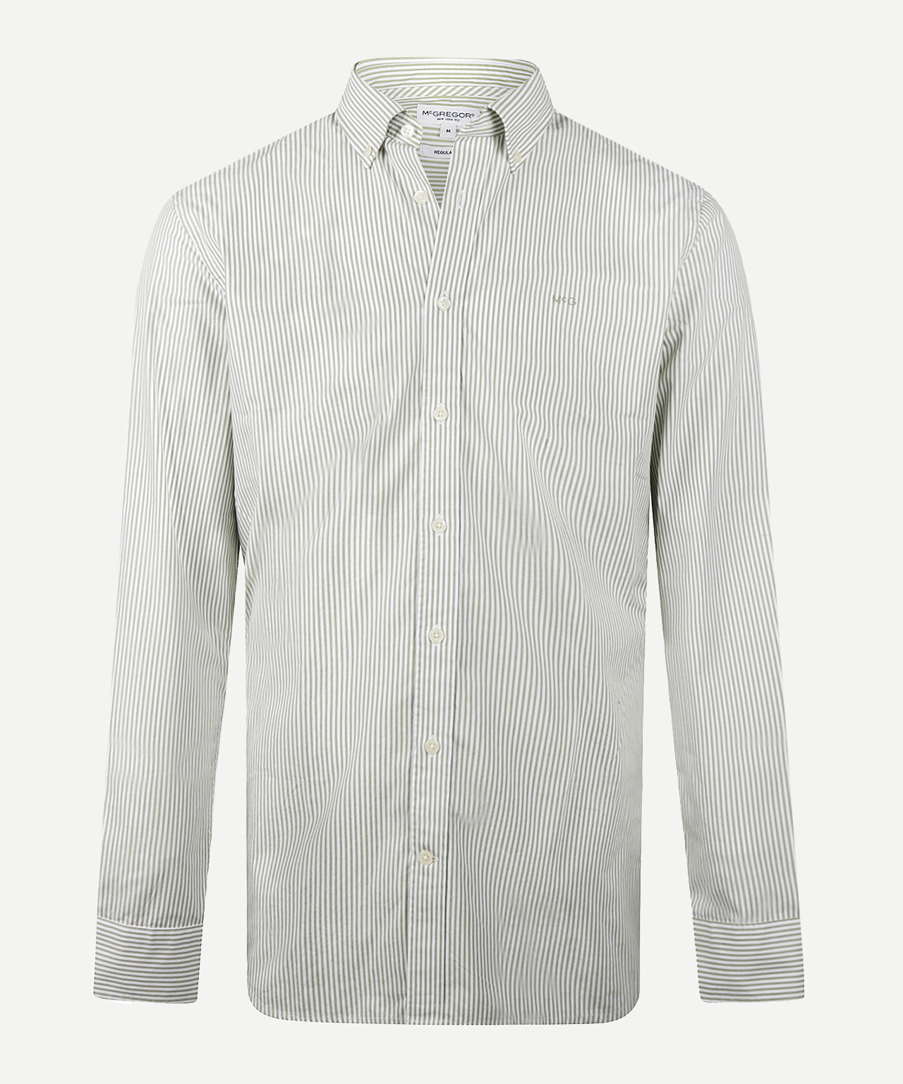 Crafted from 100% premium cotton, this shirt has a regular fit for comfortable everyday wear. It features long sleeves, a button-down collar, and a subtle McGregor logo on the chest. The poplin weave is fine and dense, giving it a smooth feel with a subtle sheen, while the peached finish provides a soft, comfortable touch. The subtle stripe pattern gives the shirt a timeless and versatile look.