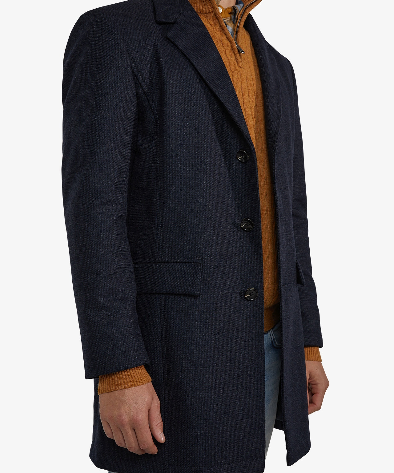 This elegant wool overcoat combines classic style with modern details. Crafted from a premium wool blend with a subtle checked pattern, the coat closes with three buttons and features two flap pockets at the front. The regular fit and fully lined interior ensure comfort and ease of wear. A timeless choice that can be effortlessly styled for both formal and casual occasions.