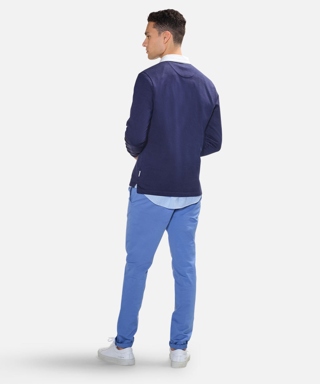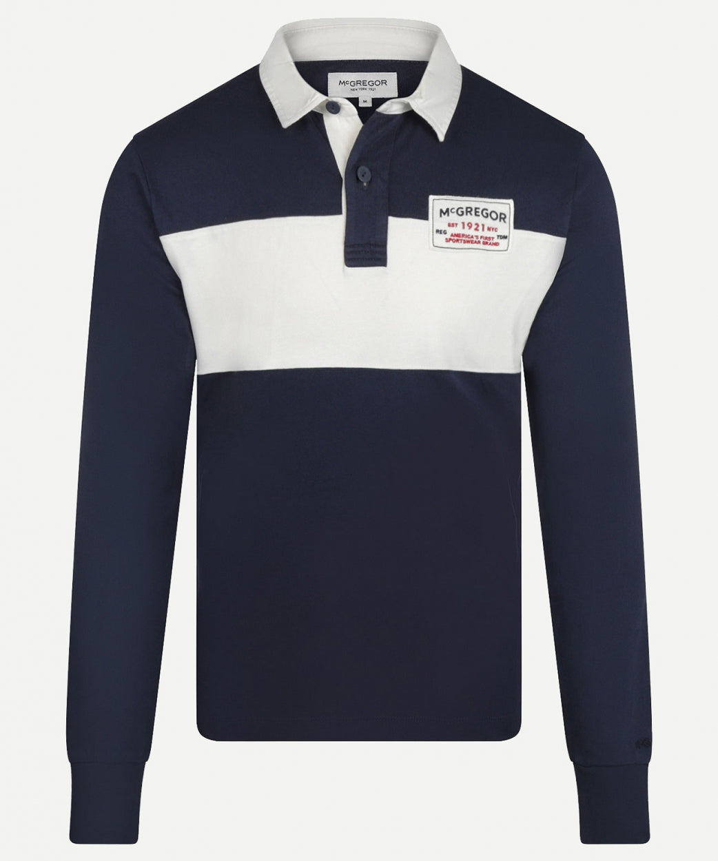 This rugby jersey has long sleeves and a white block and badge on the chest. The rugby jersey has a small McG logo embroidery on the sleeve and is provided with side slits and a 2-button closure.
