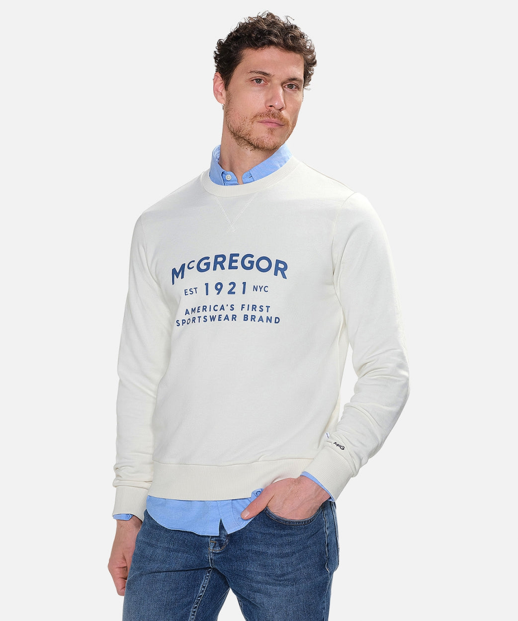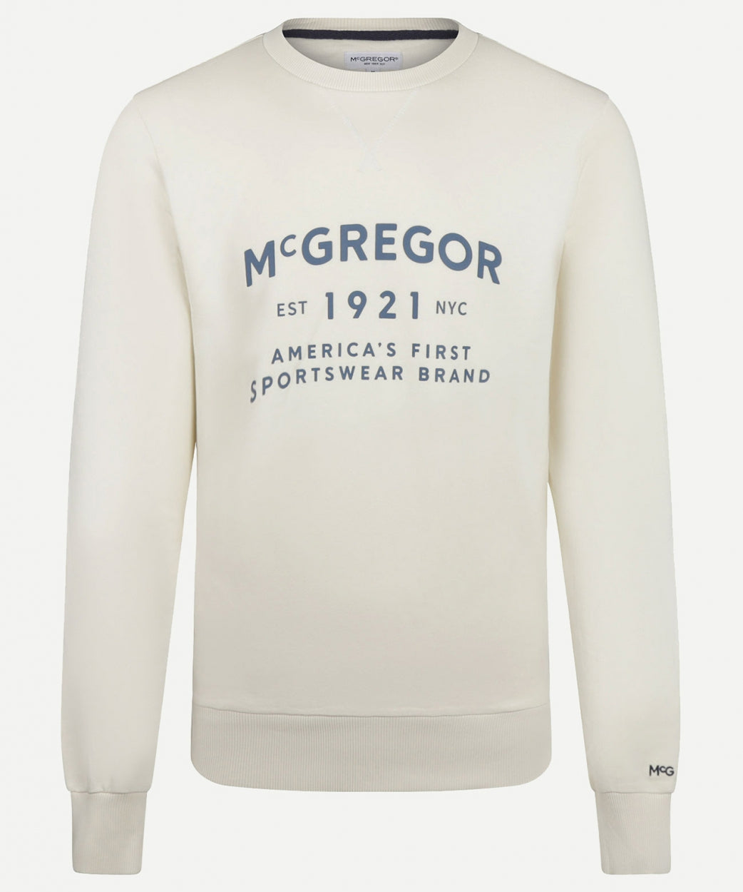 This sweater has a round neck and an 'America's first sportswear' print on the chest. The contrasting McG logo is subtly embroidered on the left sleeve.
