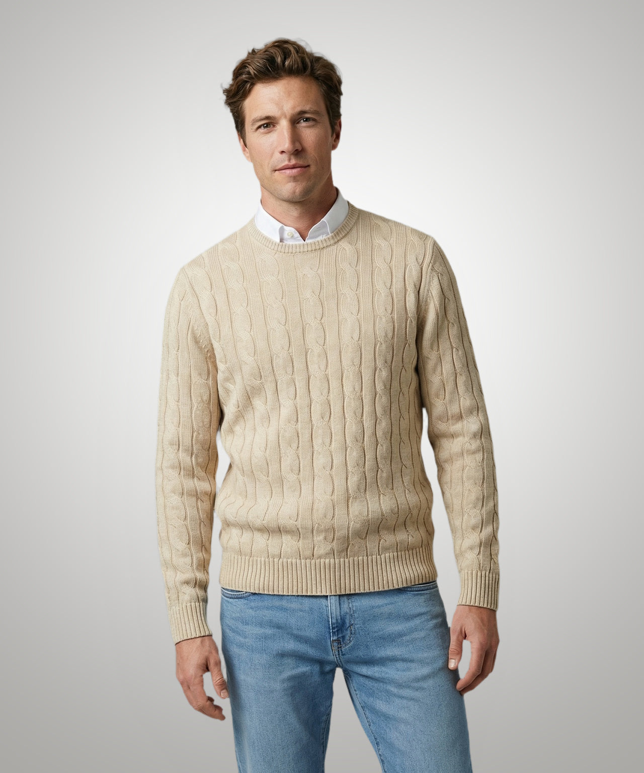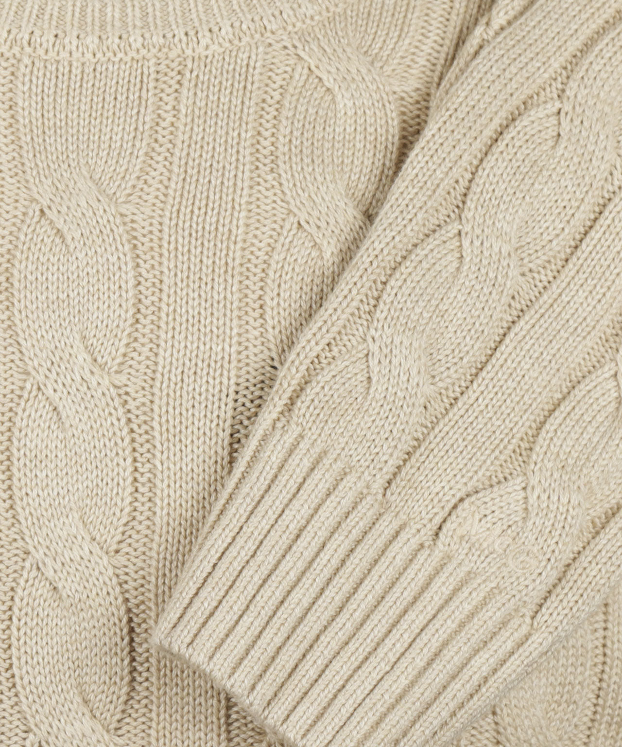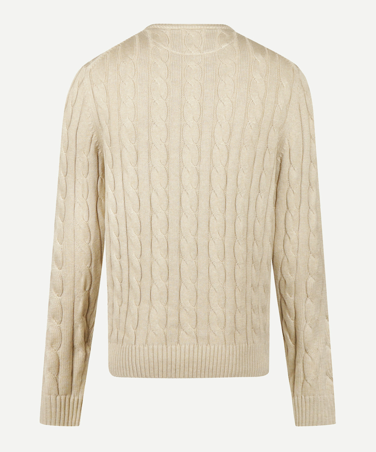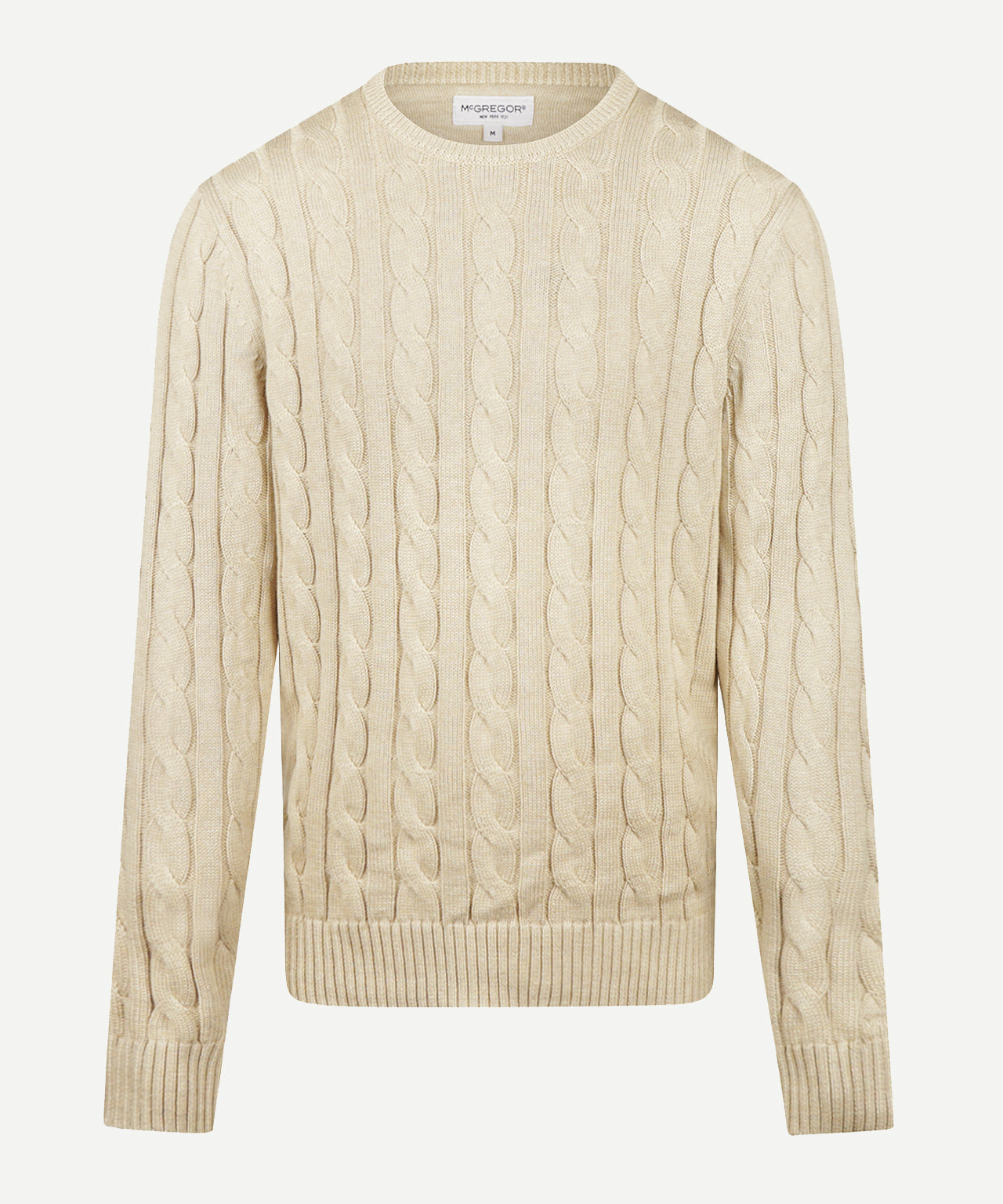 This crew neck sweater is made of 100% cotton and offers a comfortable and breathable feel. It has a regular fit, long sleeves, a ribbed crew neck, and ribbed cuffs. The classic cable knit pattern gives it a timeless and stylish look.