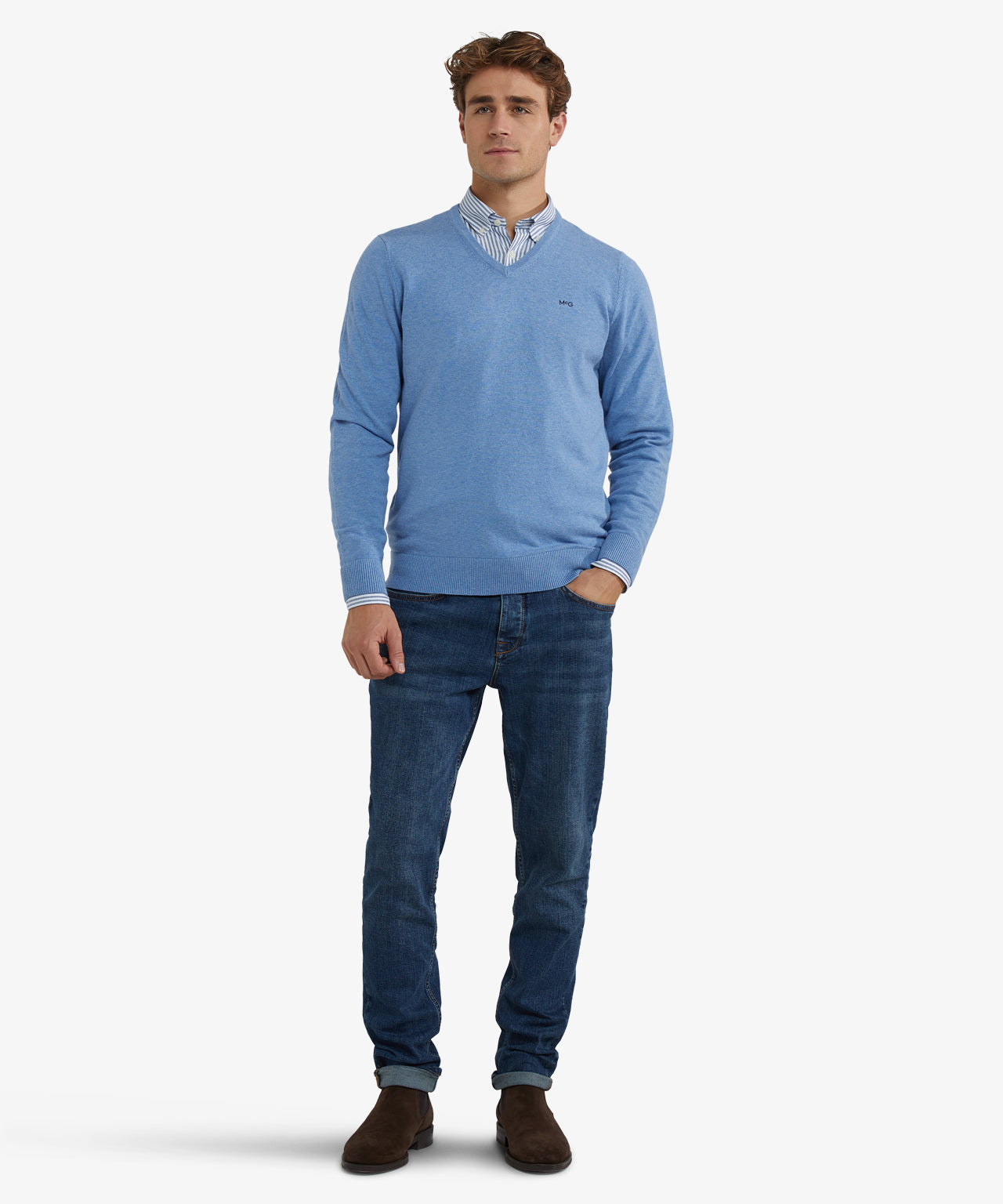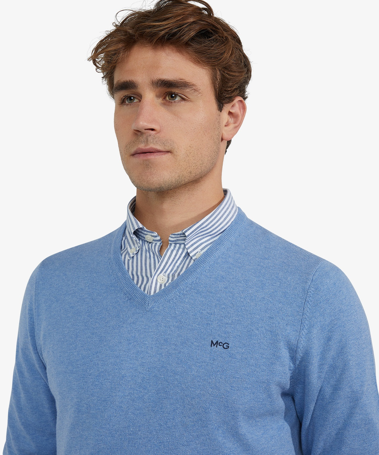 This sweater is crafted from a premium blend of cotton and merino wool for a soft and comfortable feel. It features long sleeves, a ribbed V-neck, and ribbed cuffs. A subtle McGregor logo is featured on the chest. A timeless and versatile sweater, perfect for both casual and smart-casual looks.