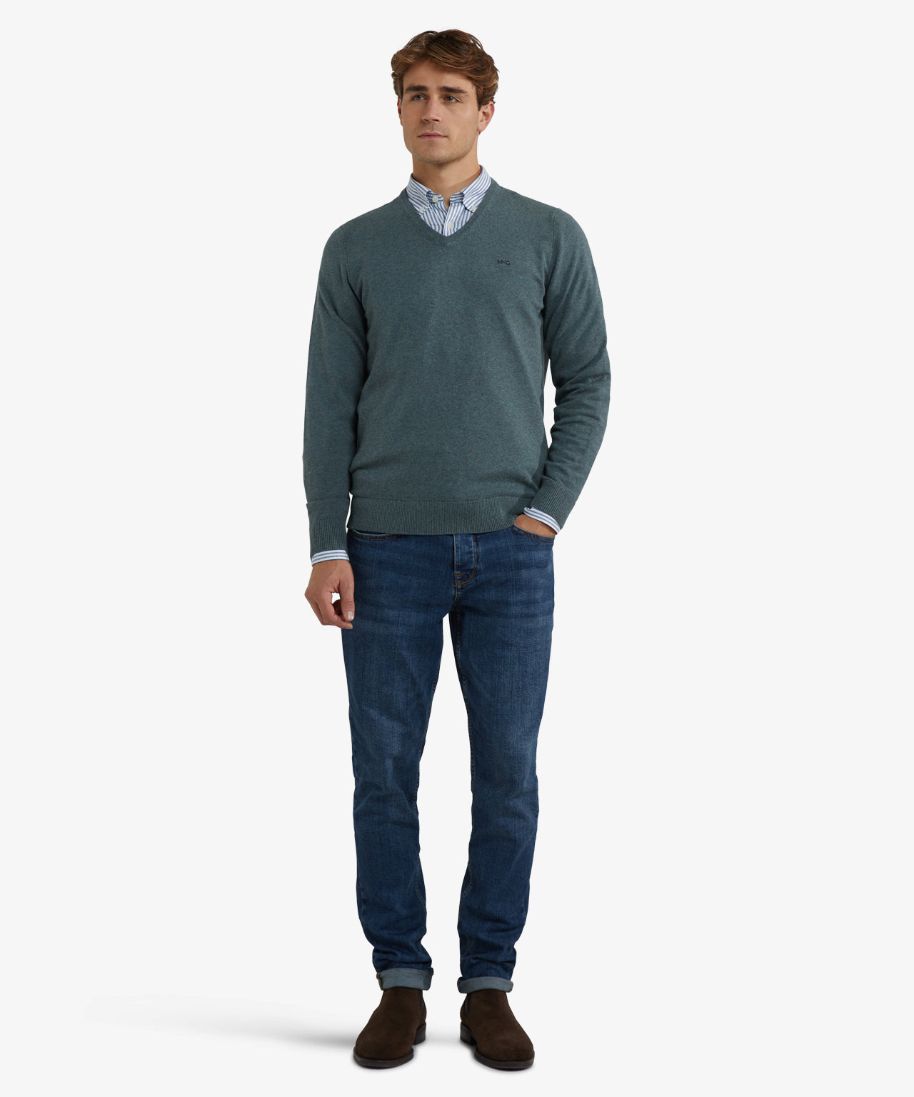 This sweater is crafted from a premium blend of cotton and merino wool for a soft and comfortable feel. It features long sleeves, a ribbed V-neck, and ribbed cuffs. A subtle McGregor logo is featured on the chest. A timeless and versatile sweater, perfect for both casual and smart-casual looks.