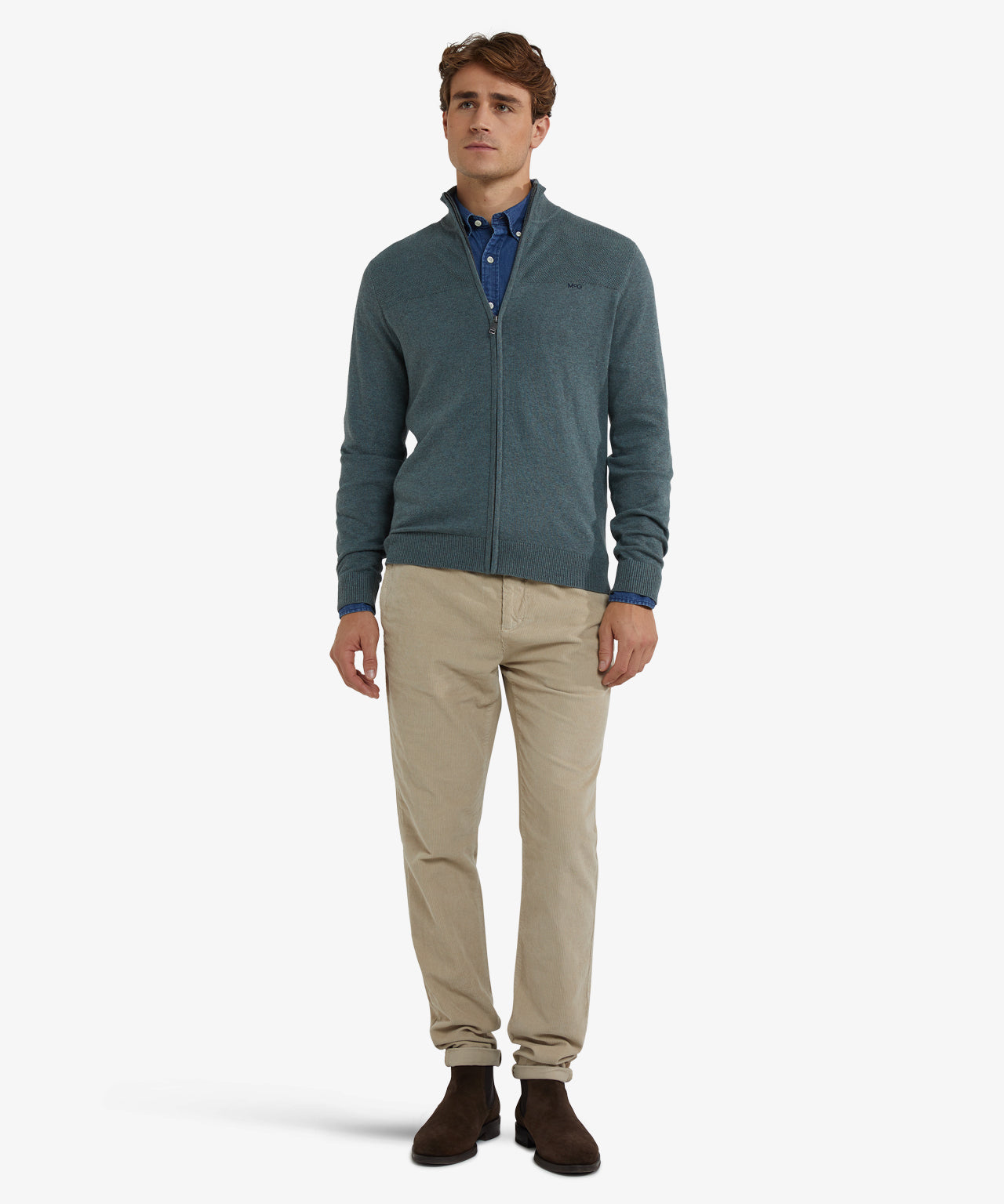 Dit ritsvest is gemaakt van een hoogwaardige mix van 70% katoen en 30% merinowol, voor een zachte, comfortabele en luxueuze draagervaring. Het vest heeft een regular fit, lange mouwen, een ribgebreide ronde hals en ribgebreide manchetten. De metalen ritssluiting en het subtiele McGregor-logo op de borst geven een verfijnde uitstraling. Een veelzijdig en stijlvol item voor zowel casual als nettere looks
