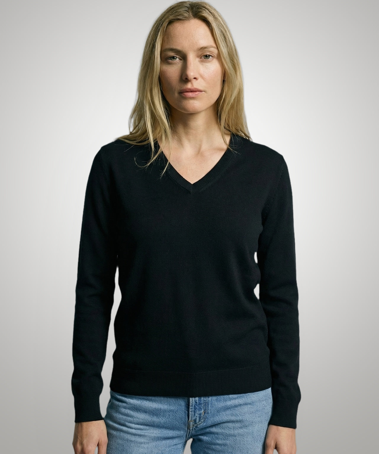 Deze dames V-hals trui is gemaakt van een hoogwaardige mix van katoen en kasjmier en biedt een zachte en comfortabele draagervaring. Het materiaal voelt licht en luxe aan, terwijl het zorgt voor optimaal draagcomfort gedurende de dag. De trui heeft lange mouwen, een ribgebreide V-hals en ribgebreide manchetten voor een verfijnde afwerking. Dankzij het tijdloze ontwerp is dit item seizoen na seizoen stijlvol te dragen.